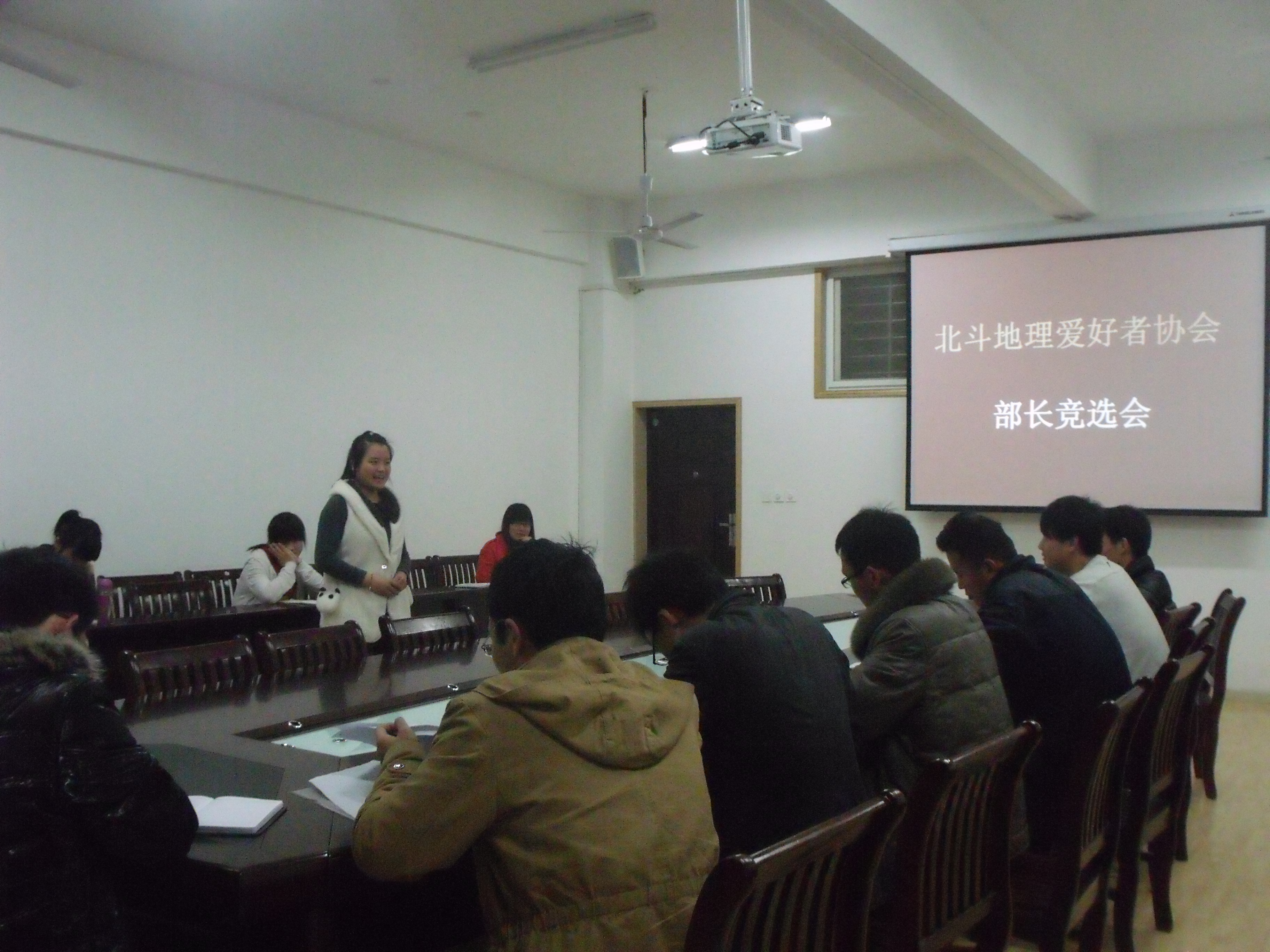 3月18日,地理爱好者协会部长竞选会在教三201召开。有十五名选手参加了竞选。理工系团总支副书记陈莉、学生会副主席原飞、地协会长张帅、团支书吴峰、副会长张一博、张森、协会助理李洪彬担任评委。
