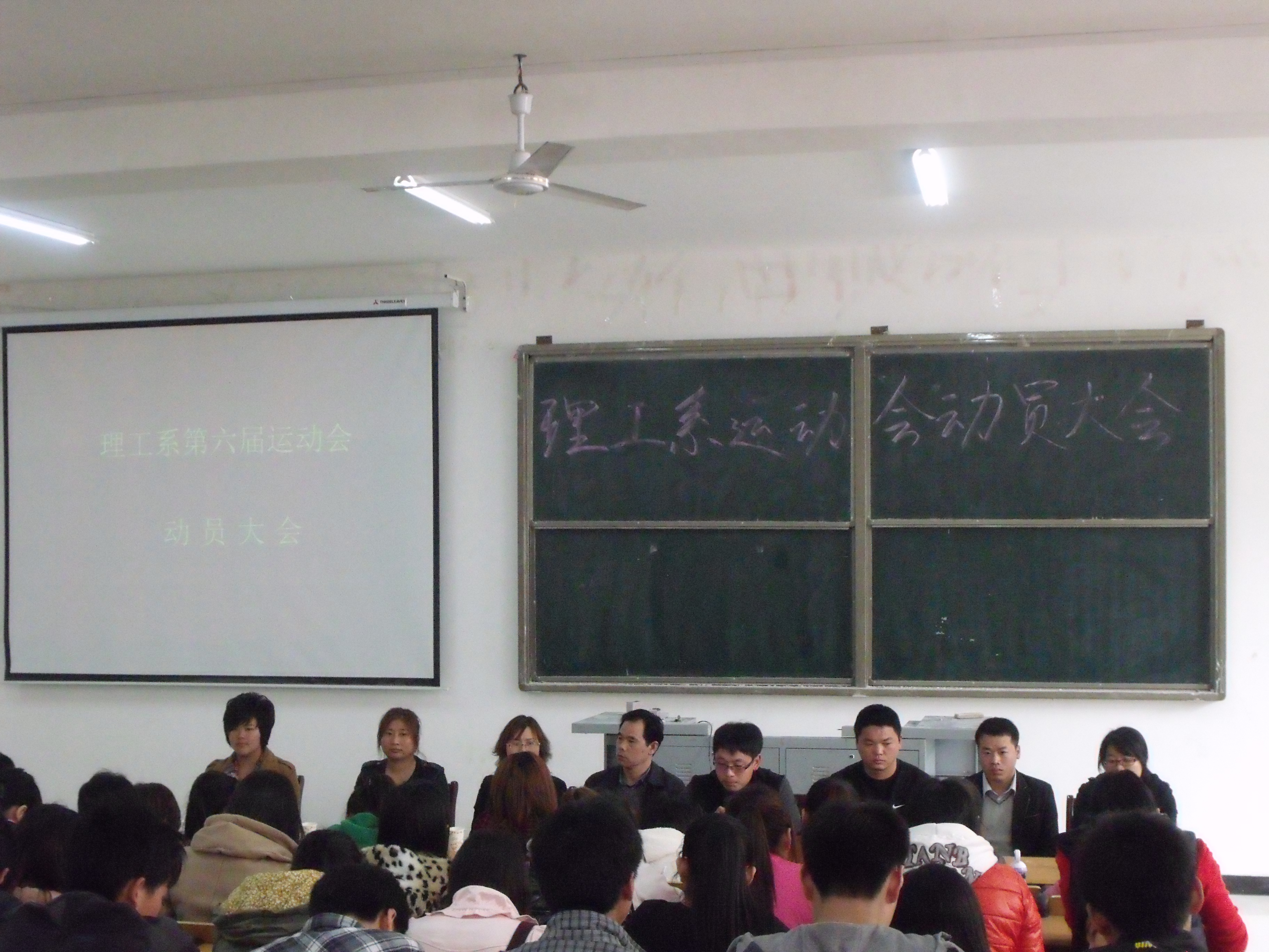 4月1日中午,理工系在教三113教室召开第六届运动会动员大会。系副主任管文水,系党总支副书记兼学工秘书陈俊,系团总支书记耿家先,系辅导员老师以及全体学生会成员和全体运动员参加本次大会。会议由陈莉主持。