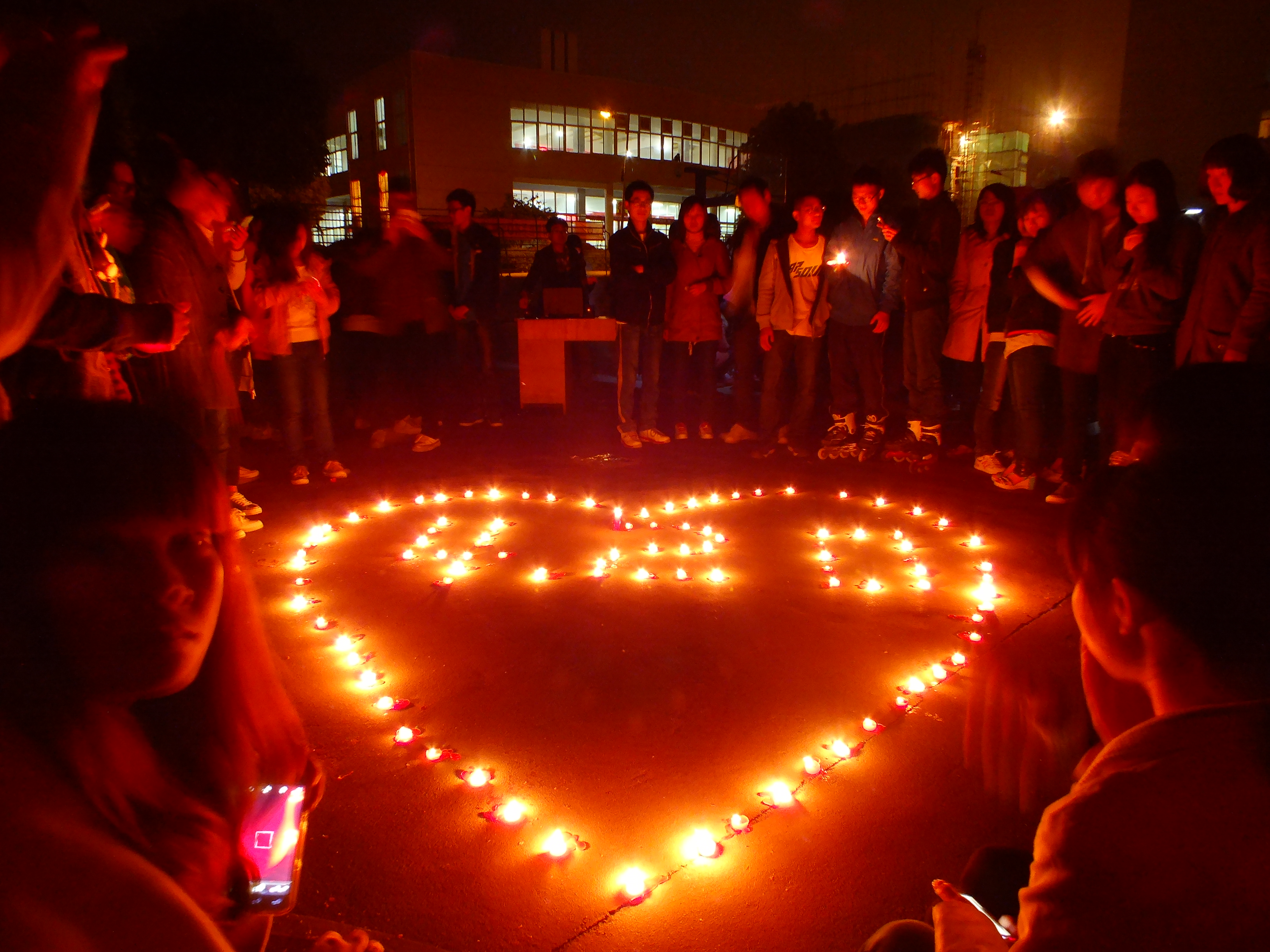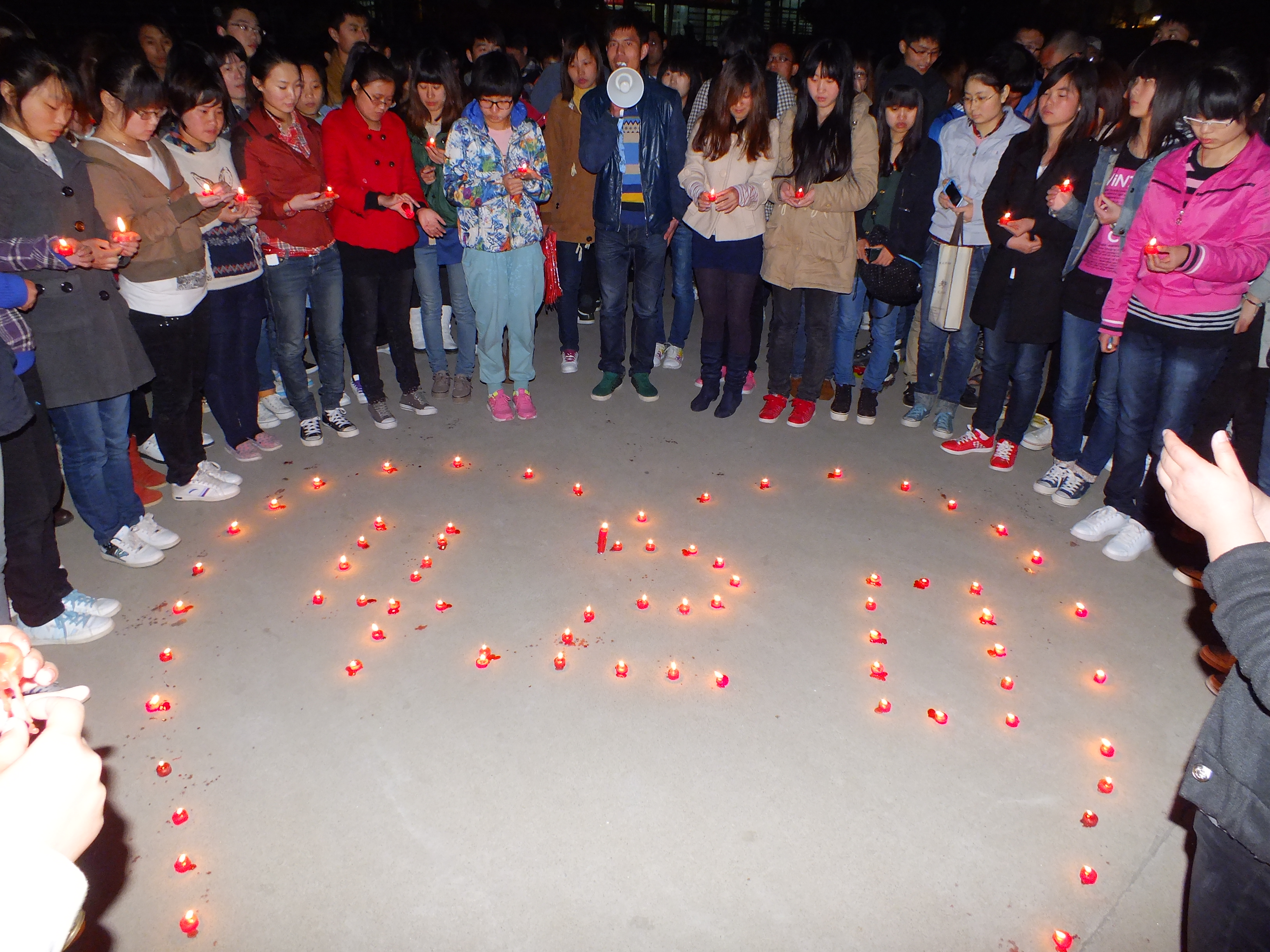 同学们点燃蜡烛组成心形,并放飞写满对雅安人民祝福的孔明灯,以此为雅安人民祈福。一盏盏写着“雅安坚强”、“雅安平安”、“我们一直在一起”等祝福语的孔明灯向着西南方向天空飞去,同学们向西南方向大声喊着“雅安加油”。