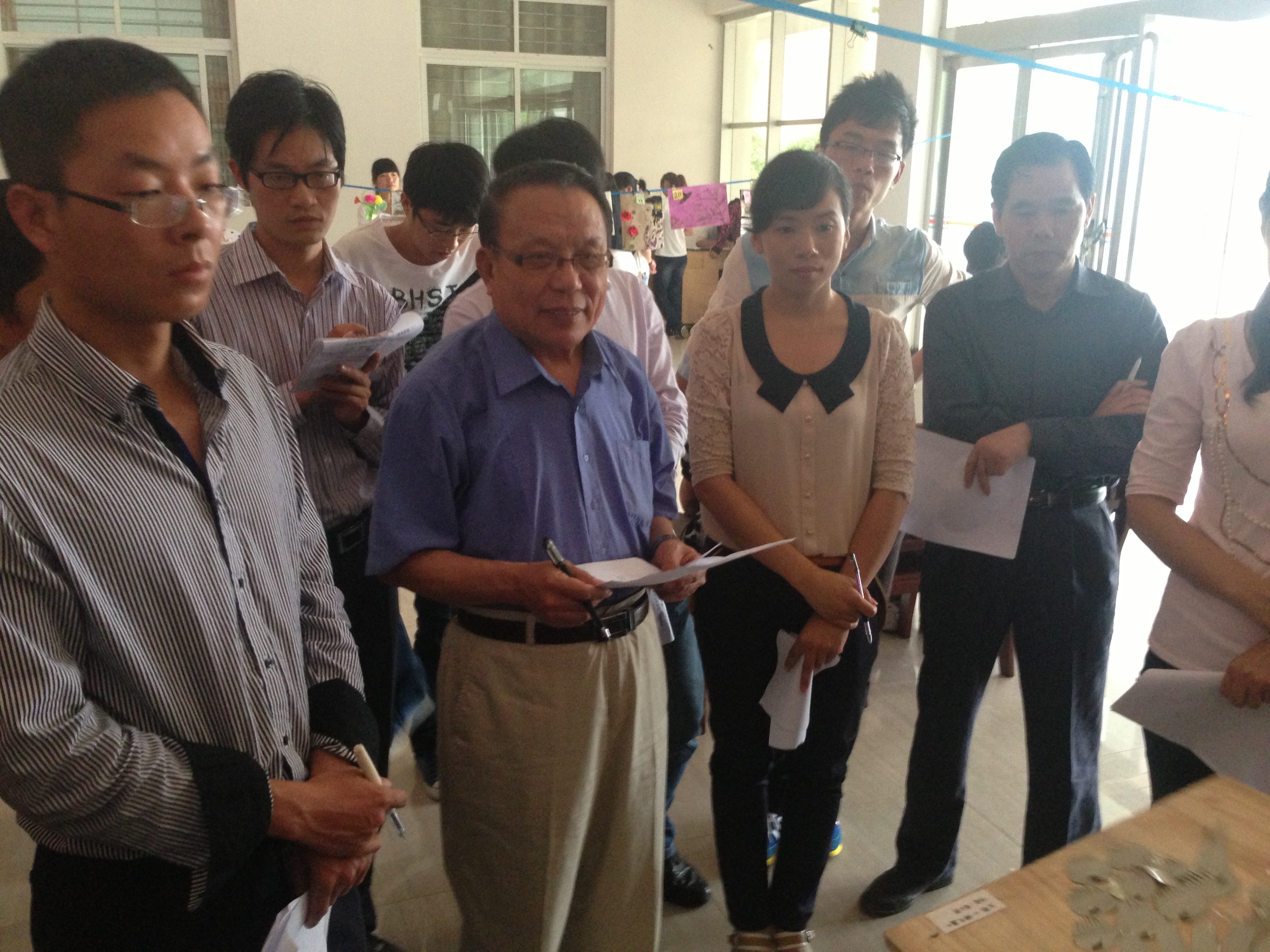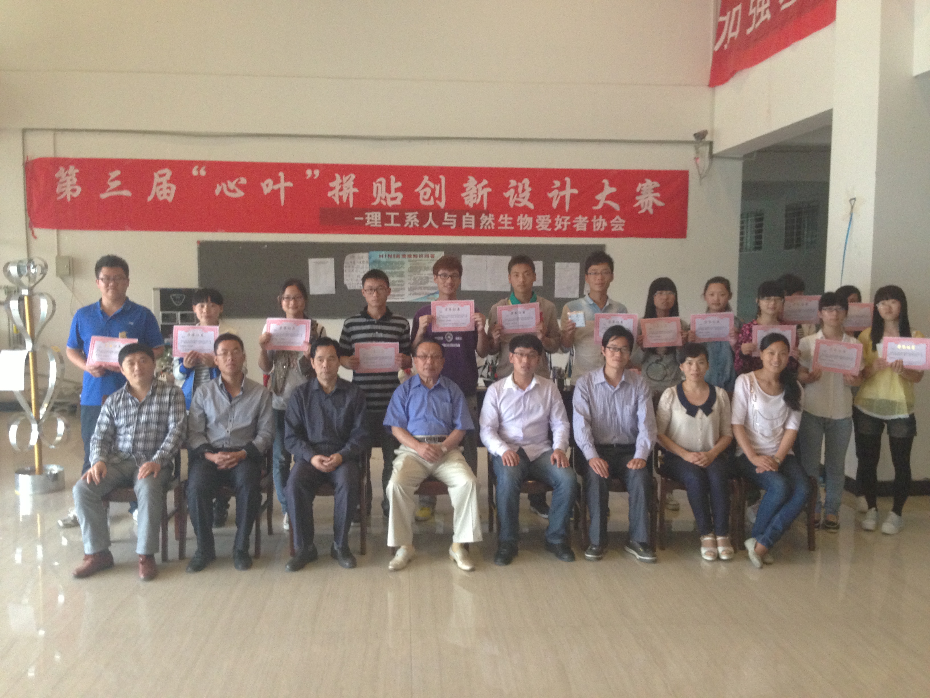 5月17日下午,由理工系人与自然生物爱好者协会举办的第三届“心叶”拼贴创新设计大赛决赛在理工楼一楼大厅成功举办。决赛荣幸的邀请到了理工系主任钟迪生教授、副主任管文水教授、党总支副书记兼学工部秘书陈俊老师、行政秘书杨晓杰老师、教学干事高永平老师和生物教研室高进勇老师、陈家瑞老师、鲁有强老师担任评委及颁奖嘉宾。
