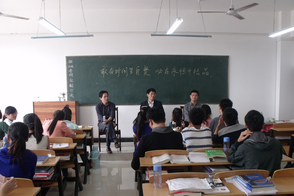 交流会上,刘墨林就考研计划与复习方法,考研信心的树立,以及有关专业的选择和报考院校选择等方面的问题作出耐心讲解;徐元国讲话幽默风趣,既讲明了考研重点,又大大提高了同学们的考研热情和兴趣;管文水在总结发言中对同学们提出了希望,鼓励大家确立奋斗目标,报考符合自己实际的高校。