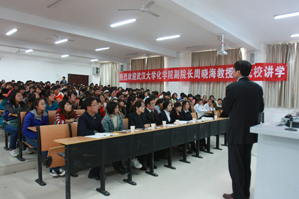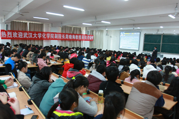 11月16日下午,应理工系特邀,武汉大学化学科学学院副院长周晓海教授在教三-113做了题为《新型离子液体的开发与应用》的学术报告,理工系主任魏明坤,化学教研室老师及全体化学专业的学生一起聆听了报告。