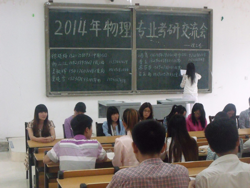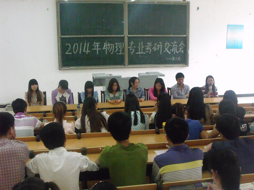 会上,冯金地老师首先简要介绍了2010级物理学专业今年考研的各项统计数据。然后由优秀毕业生们一一做 经验交流。成功考取中南大学凝聚态物理专业的徐晓梅同学讲解了在漫漫考研征途中需注意的事项,她特别强调在院校专业选择方面必须全面考虑、合理定位,只有确定了正确的目标,才能将全部努力转化为最有价值的成果。考取武汉大学理论物理专业硕士研究生的杨三江同学,着重介绍了自己在备考过程中专业课复习方面的心得体会,强调重在平时的积累。考取北京理工大学凝聚态物理的李亚同学则讲述了她在备考过程中各阶段的经历,并结合自身经验告诫同学们应当如何踏踏实实地做好最充分的准备。而考取郑州大学凝聚态物理的冯菁同学重点谈到自己考研学校的选择过程和考研英语的复习。考上重庆大学物理学的吴颖晖同学谈到自己考研历程时,认为团队协作,宿舍室友们互帮互助,一起备考是自己考研成功的重要因素。考取重庆大学材料物理与化学方向的吕亚南同学和北京科技大学凝聚态物理方向的苏莎莎同学则主要介绍了在备考过程中应做出的合理规划以及高效利用参考书、辅导书的方法,同时强调了反复做历年考研专业课真题的重要性。