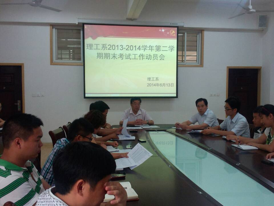系主任魏明坤教授就2013-2014学年第二学期期末考试工作做了如下强调:一、辅导员老师要做好学生考风考纪教育工作,引导学生文明考试、理性考试;二、系里老师要按照学院要求监考、评阅试卷、登载成绩等;三、系里相关负责老师要严格按照学院整体安排,积极配合相关部门做好期末考试工作,圆满完成本学期的期末考试任务。