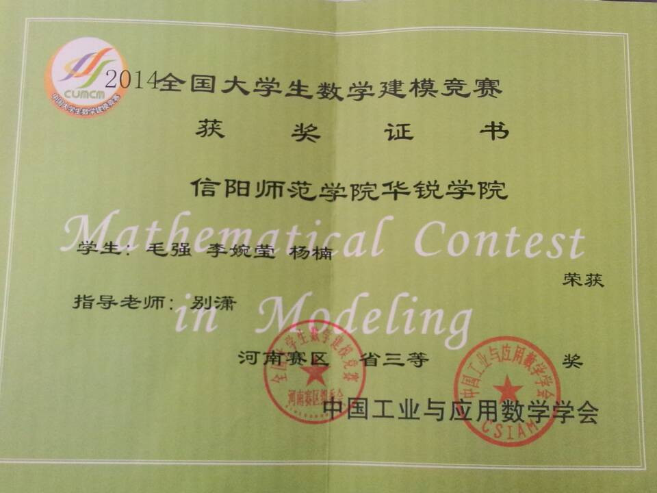 2014年,在理工系主任魏明坤和副主任管文水的亲切关怀指导下,并在数学与计算机科学系的大力支持下,由物理教研室组织6名学生李婉莹,毛强和杨楠以及夏凤霞,刘华和魏静莹分成两个组首次报名参加全国大学生数学建模竞赛。8月,6名参赛选手冒着酷暑参加了为期一个月的赛前培训,在老师与同学们的共同努力下,2支参赛队伍都顺利提交了建模比赛论文。最终,李婉莹,毛强和杨楠参赛队喜获省级三等奖的好成绩。