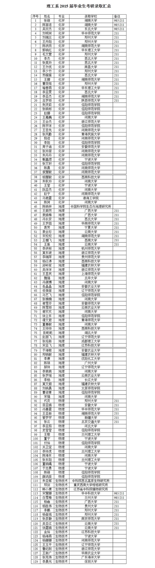 第二,考取“985”、“211”等重点大学的人数较多,其中,“985”院校5人,“211”院校44人,中国科学院相关研究所2人。这些同学被中科院、华中科技大学、湖南大学、兰州大学、华东理工大学、东北大学、南京师范大学、云南大学、西南大学、郑州大学、河南大学、贵州大学等科研院所和著名高校录取。