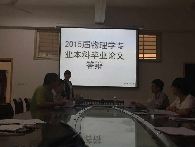 2015年5月14~15号物理教研室组织2011级物理学专业4个小组共计35名毕业生在理工系会议室201进行了两场本科毕业论文答辩。物理教研室冯金地,董玉静,高延利和贾小平4位老师参加了本届毕业生论文答辩。