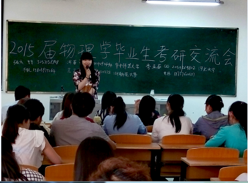 为了进一步提高理工系物理学专业2012级学生的考研热情,明确考研目标,掌握相关考研技巧,了解更多考研信息,2015年5月18日下午16:50,物理教研室组织的2015年考研经验交流会在华锐学院理工楼605教室举行。物理教研室冯金地老师和贾小平老师、11届考研中成绩优异、经验丰富的7位毕业生学姐张云、王亚新、冯喜霞、李亚茹、董宁,田亚娟及代爽,12级物理班,13级