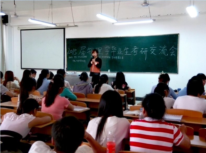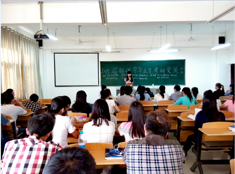 首先,物理教研室主任冯金地简要介绍了11级物理学专业考研情况:本届物理班毕业生考研率达到了54.28%,再创历史新高!接着分析了当下的考研形势,鼓励12,13级同学们积极考研,努力拼搏,奋斗不止,并对此次交流会的成功举办致以衷心祝愿。