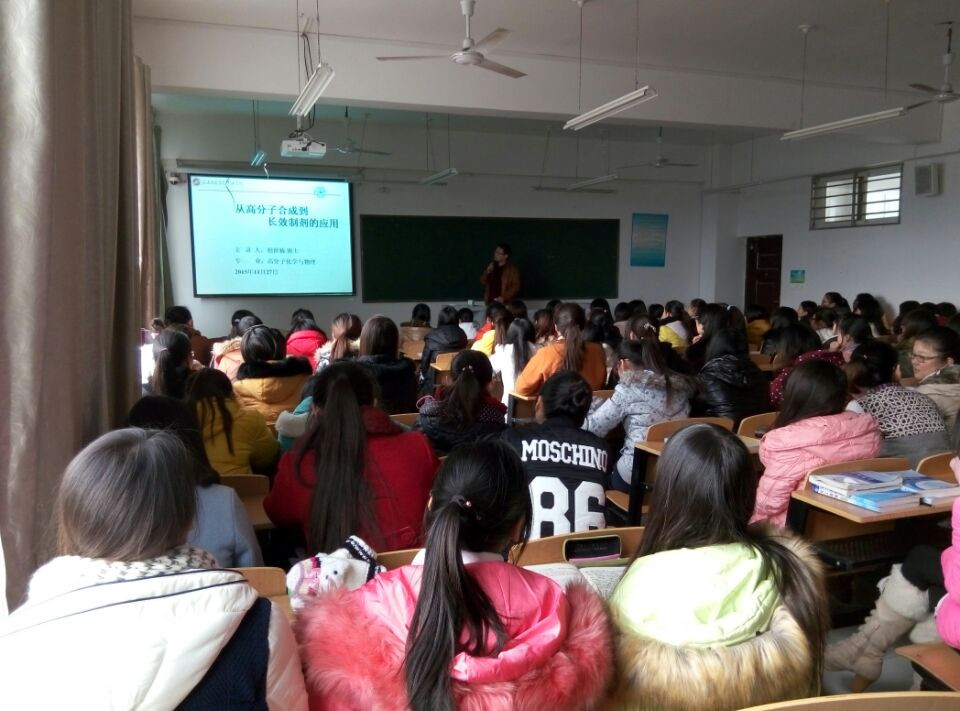 相世栋博士从博士生期间研究的高分子聚合物合成出发,结合现在做的长效制剂、缓释微球等讲到高分子聚合物在长效制剂中的应用,并结合自己的自身经历分享了学习中的一些经验总结。整场报告精彩,有趣,使师生了解了长效制剂前沿的一些知识,并激发了同学们学习化学的兴趣,增大了考研学生考研动力,使大家受益匪浅。