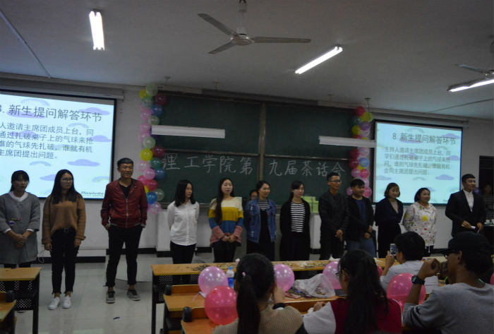 出席本次活动的有理工学院学生会主席团和理工学院17级全体学生会成员。茶话会由一场热辣的开场舞拉开帷幕,热辣的开场舞将茶话会的气氛调动起来。歌曲《远走高飞》,美妙的音符在空中跳动,成员们都忍不住随声附和,全身心的沉浸在音乐的海洋里。游戏《你做我猜》这是由4人一组通过动作演示成语由最后一个人猜。这些成语都是我们平常所熟知的,演示者丰富的动作令台下的观众捧腹大笑。《青春飞扬,梦在前方》深情的朗诵,给予我们内心的触动,青春是多彩的,是充满活力的。游戏《翻滚吧,面粉!》最是搞笑且有趣,游戏过后每个人满脸的面粉引得大家哈哈大笑,把气氛带进了高潮。歌曲《动物世界》动听的音乐萦绕在每个人的耳畔,让人久久不能忘怀。游戏《爱你在心,口难开》,每组两人互相捏着对方的耳朵且口中含着水,比一比谁先将水先喷在对方的脸上,显然学生会主席和学长这一组成了全场的焦点。小品《上课请听讲》语言诙谐幽默,将叛逆的学生与无奈的老师这两个角色演绎的淋漓尽致。游戏《新生提问解答环节》,由新生扎破桌子上的气球来抢问,每一个倒数的结束总会响起一连串的爆炸声,这个环节很是讨人喜欢,燃爆全场。游戏《击鼓传花》人们时刻紧绷着神经准备传递,都不希望花环传到自己,不然各种各样的惩罚就会轮到自己,吃柠檬,真心话,选女生等等。最后茶话会在动听的音乐声中完美结束,令许多人意犹未尽。