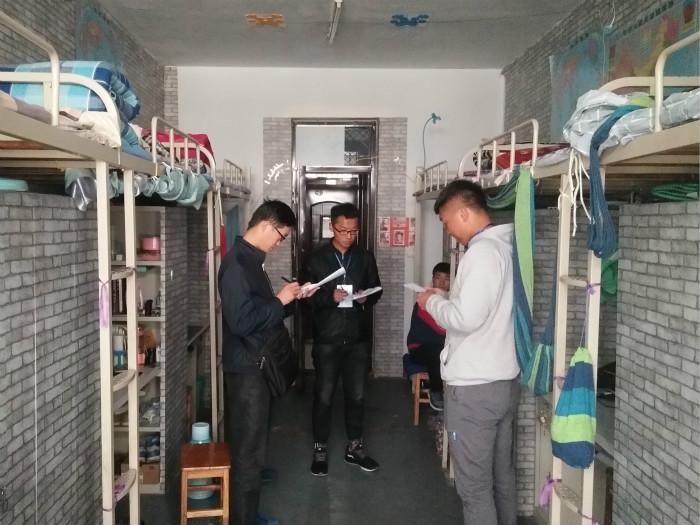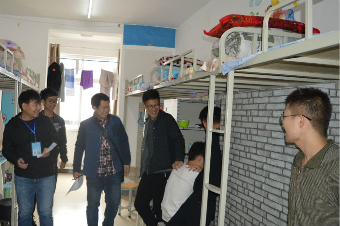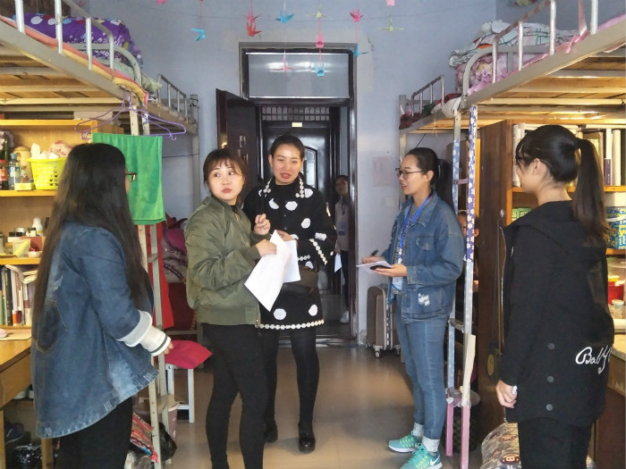 2017年11月10日中午,理工学院学工秘书杨晓杰老师、团总支书记梁书荣老师,辅导员黄艳伟老师、刘硕老师、张若琳老师、张帆老师、张文银老师及学生会主席团成员、教检部全体成员一同对理工学院宿舍文化、卫生、安全进行了检查。领导老师及学生会成员风分成队走访学生宿舍,对地面桌面卫生、宿舍文化节装扮和安全方面进行了严格的检查。干净整洁的宿舍卫生,各种风格的宿舍装扮,不少宿舍的学生们受到领导老师的表扬。在检查的过程中,老师不仅与同学们探讨怎样装扮出漂亮的宿舍,还和同学们交谈了一些关于学习和生活方面的话题。同时,领导老师关切的叮嘱同学们要注意用电安全,勤晒被子。