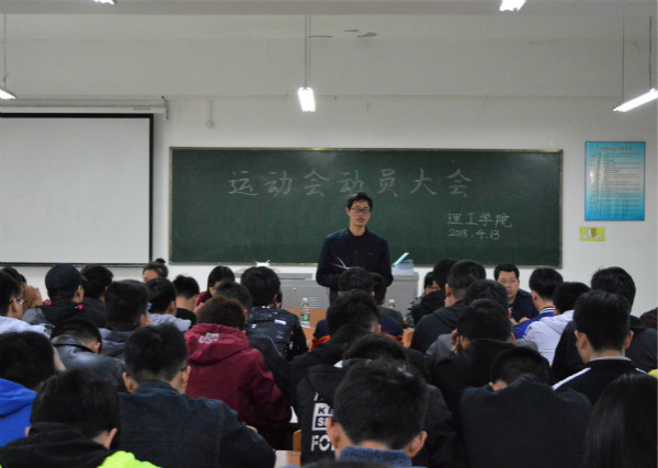 2018年4月13日,理工学院第十一届运动会动员大会于理工楼502成功举办,理工学院院长魏明坤,党总支书记张红梅,学工秘书杨晓杰,团总支书记梁书荣,辅导员黄艳伟、刘硕、张若琳、张文银,理工学院全体运动员及各项目负责人参加了本次会议。