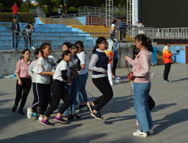 春暖花开,生机勃勃。为了展示学生的青春活力、团结协作的精神风貌及调动广大学生参与运动的积极性,4月18日,信阳学院迎来了一年一度的趣味运动会的第二个项目――跳绳。今日到现场为同学们加油的有:教职工秘书杨晓杰老师,辅导员黄艳伟老师、刘硕老师、张若琳老师等,学生会主席阚攀、副主席何苗等和跳绳项目负责人、各班同学。