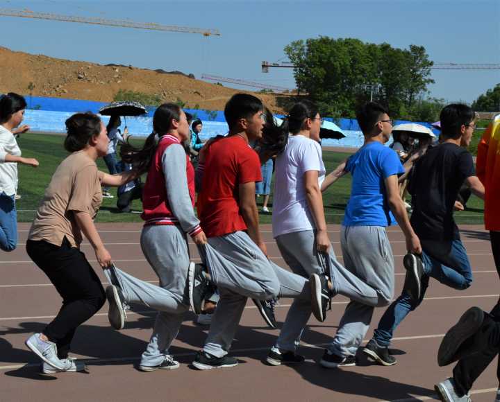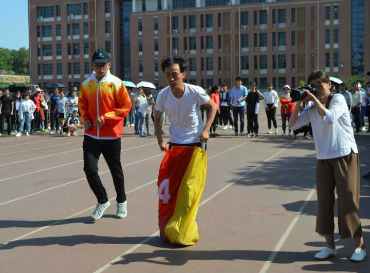 春光明媚,万里无云。为了营造校园良好的体育氛围,增强学生的运动能力,4月19日下午两点三十分,信阳学院举行的趣味运动会已经进行到第三个项目——链接加速与袋鼠跳,此次比赛在田径场西侧进行。