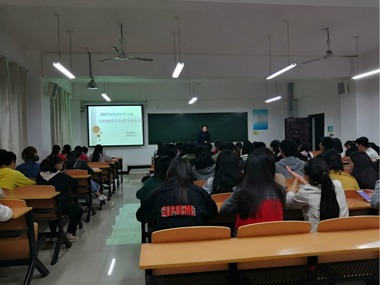 2018年4月25日晚7点半,地理教研室的魏新玲老师和白玉娜老师在理工楼楼502教室对2015级地理科学专业学生外出广西桂林的自然地理实习召开动员会。