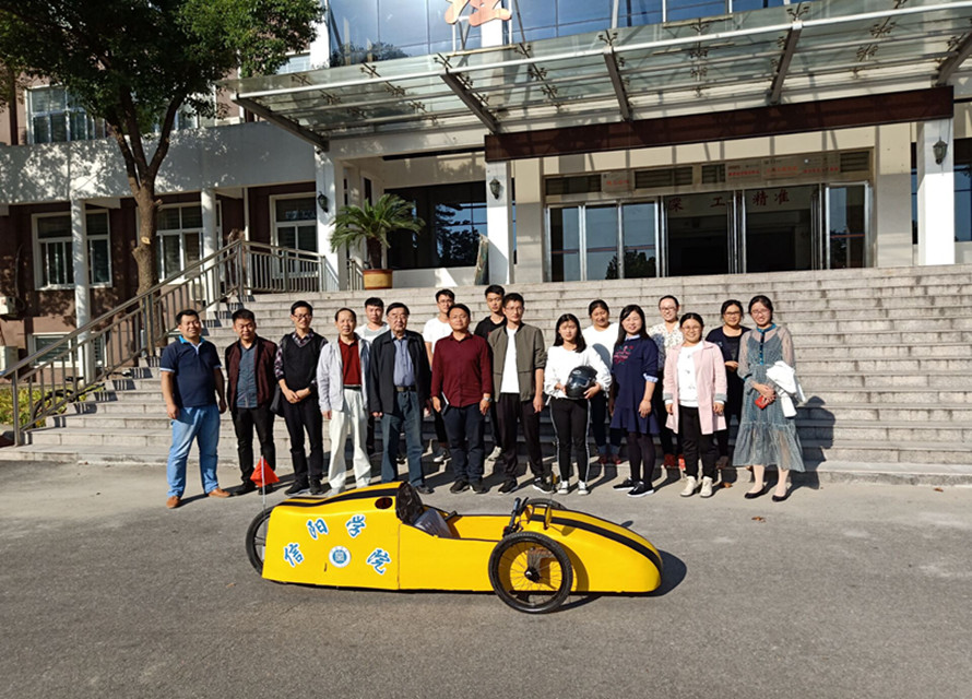 10月10日下午理工学院魏明坤院长、张红梅副书记和行政工作人员及全体辅导员应邀来到理工楼门前观看信拓者节能车作品展。汽车教研室肖生发教授、节能车领队老师张锐以及信拓者团队5名学生成员陪同学院领导一起验证节能车试跑成果。