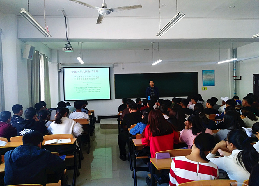 为深入贯彻落实党的十九大会议精神和习近平总书记在全国教育大会上重要讲话精神,进一步加强教师队伍建设,提高师德水平和职业素养,根据中共河南省委《关于追授李芳同志“河南省优秀共产党员”称号并开展向李芳同志学习活动的决定》(豫文〔2018〕120 号)精神,中共河南省委高校工委、中共河南省教育厅党组决定在全省教育系统深入开展“向李芳同志学习,争做‘四有’好老师”主题教育活动要求,理工学院学生第一党支部于10月29日在理工楼502召开“向李芳同志学习 争做‘四有’好老师”主题教育会议,2017级化学专业和汽车服务工程专业以及2018级机电专业全体同学参加此次会议。