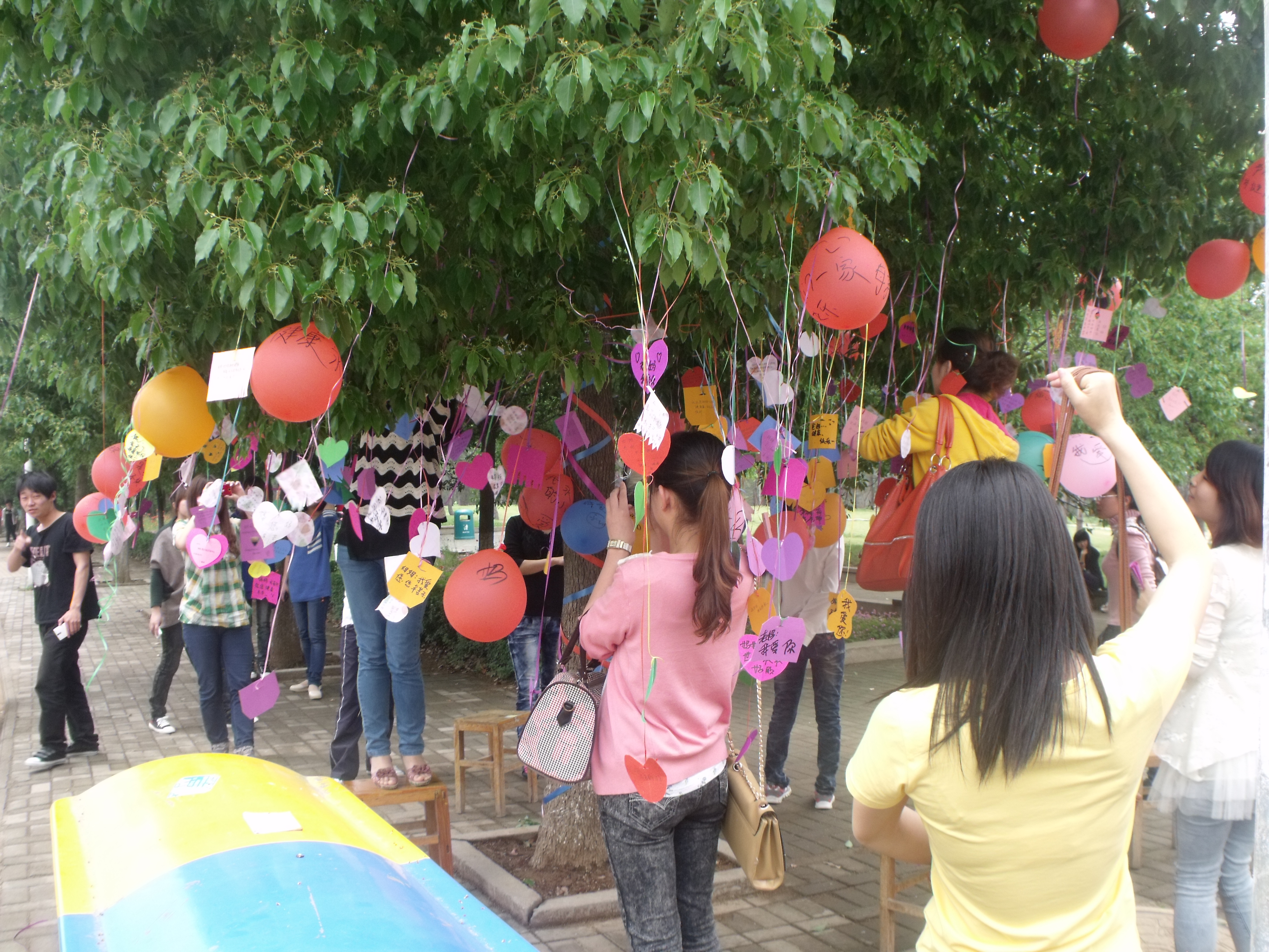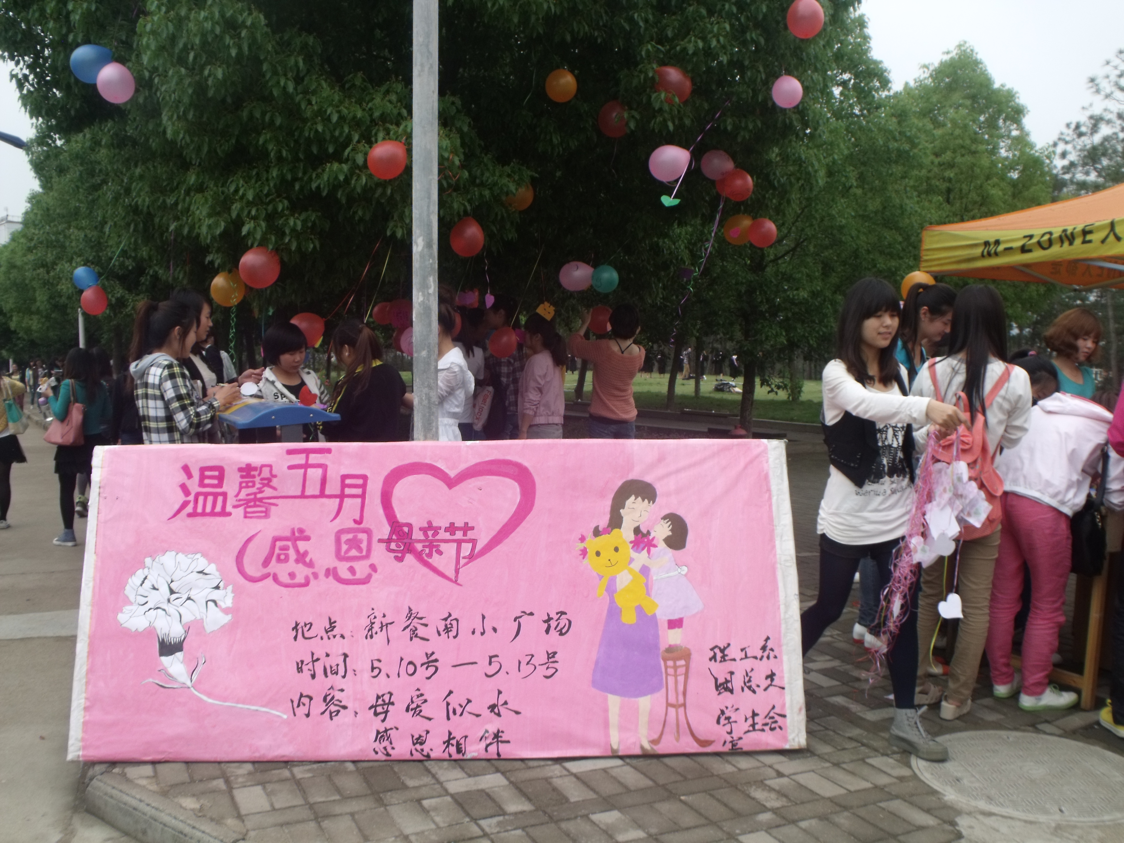 2013年5月10日我系学生会女生部于新餐旁举办母亲节活动,此次活动以“感恩母亲”为主题,在七色卡片上、便利贴上、气球上写上对母亲及家人的祝福,然后系在树上。营造“许愿树”——希望树,为母亲祈福。通过摄影、采访毕业生以及在校学生、录音做视频等形式表达对母亲的感恩以及祝福。活动进行为期一天,这期间同学们热情认真参与,真切的表达着自己对母亲的爱和对家人的关心。绑好的纸片随风飘扬,绿树映着彩色的祝福,传达着每位学子对母亲热切真诚的爱和祝福。