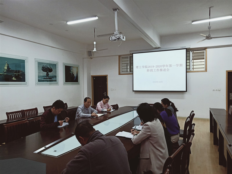 10月9日下午,理工学院在理工楼201会议室召开2019—2020学年第一学期阶段工作推进会,理工学院院长肖生发、行政干事樊瑞、教学干事赵丹、实验室负责人杨超以及各教研室主任参加了会议。