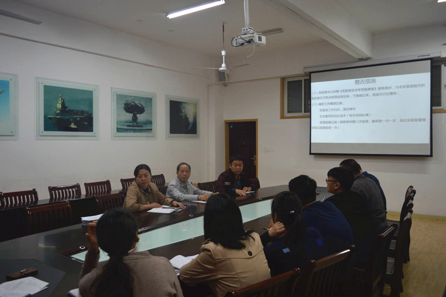 理工学院实验室负责老师杨超首先对信阳学院教务处文件进行了详细的讲解,随后提出了在学校检查中,理工学院实验室所存在的问题,并提出日后的整改措施。要求各实验中心对照《实验室安全专项检查表》逐条核对以及做好工作痕迹记录,以及规范填写实验室工作日志等。会议最后由信阳学院理工学院院长肖生发教授发表讲话。提出对各实验室的补充要求及建议。在场各教研室主任认真听取并参与讨论,并提出宝贵意见。