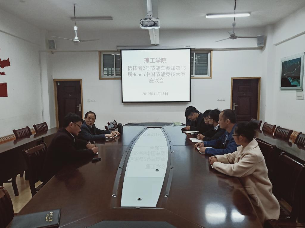 11月18日下午,理工学院院长肖生发教授在理工楼201会议室给信拓者车队师生召开“信拓者2号”节能车参加第13届Honda中国节能竞技大赛座谈会。