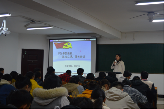 理工学院党总支副书记张红梅首先向各学生干部说明,学生干部处于学校思想教育和行政管理的第三方面军的地位,学生干部是纽带,是示范,起到着骨干带头的作用。然后张红梅书记又表明学生干部应该有坚定的政治立场、较高的政治素质,规范网络行为,并坚守共产主义信仰,遵守宗教分离、共产党员不能信仰宗教的原则等。接着张红梅书记讲述学生干部应学会如何处理好亲子、师生、同学之间人际关系,这样可以完善学生干部的人格,培养人际交往能力。最后,张红梅老师讲述学生干部健康心理的培养和维护,并教给学生干部25个快乐和减压的办法。