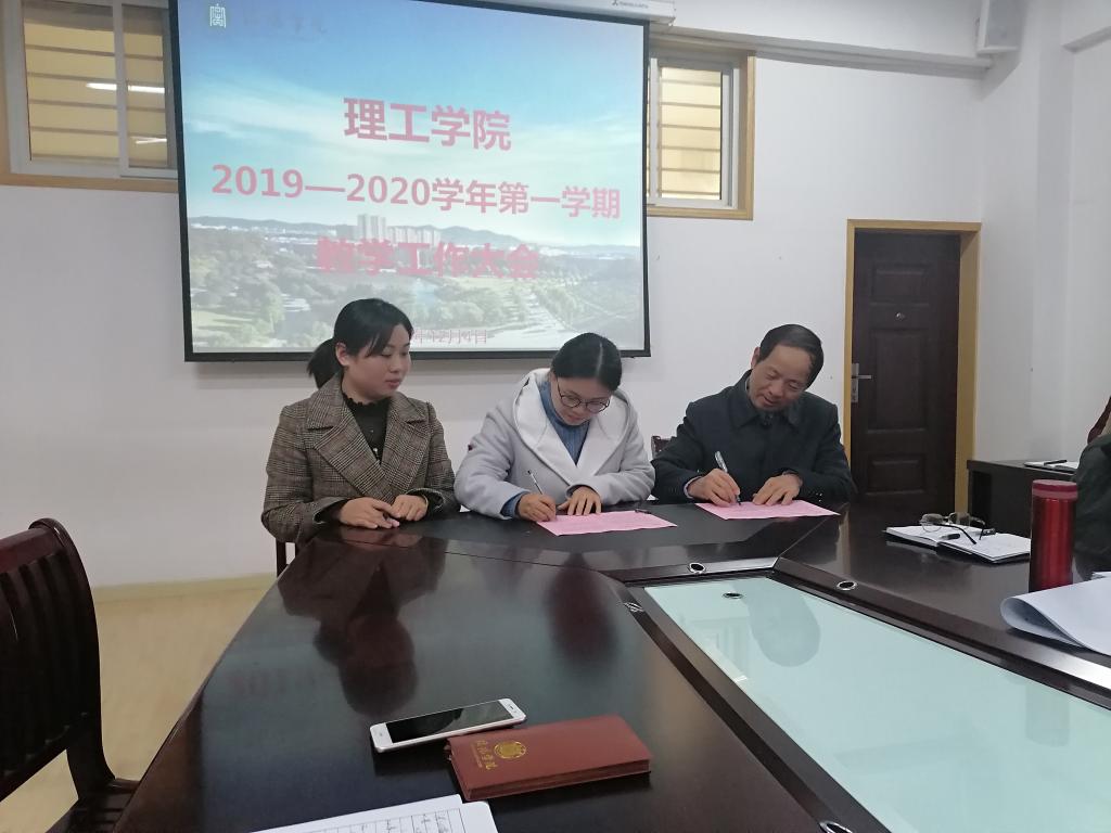 会议开始,由樊瑞老师宣读了关于理工学院《关于成立理工学院评估与建设工作领导小组的通知》,落实评估责任,督察指导及审核资料,以及评估各项工作的准备工作等。然后,肖生发和张红梅代表理工学院与各学科带头人、教研室主任、行政人员分别签订了《本科教学工作合格评估与建设责任书》。接着,肖院长带领全体教师学习《信阳学院本科教学工作合格评估实施方案》《信阳学院关于加强本科教育教学建设全面提高人才培养能力的意见》《信阳学院关于全面修订专业人才培养方案的指导性意见》《信阳学院一流本科专业建设与提升规划》等文件,肖院长指出院理工学院按照学校关于迎评促建的几个阶段也制定相应的方案,进行分工,为迎评促建做好充分的准备;同时,肖院长对下个学期的工作进行了规划。接着,张红梅针对学风问题进行要求,针对学生请假、迟到、上课玩手机的现象,提出了相应的解决办法,规范学生的行为,并要求辅导员积极的配合工作。接着,赵丹对期末监考和试卷命题工作进行了进一步的安排。最后,姚素梅教授就督导听课事情对青年教师做了要求,希望青年教师认真备课,讲好每一堂课,同时要严格遵守纪律,不能随意调课。