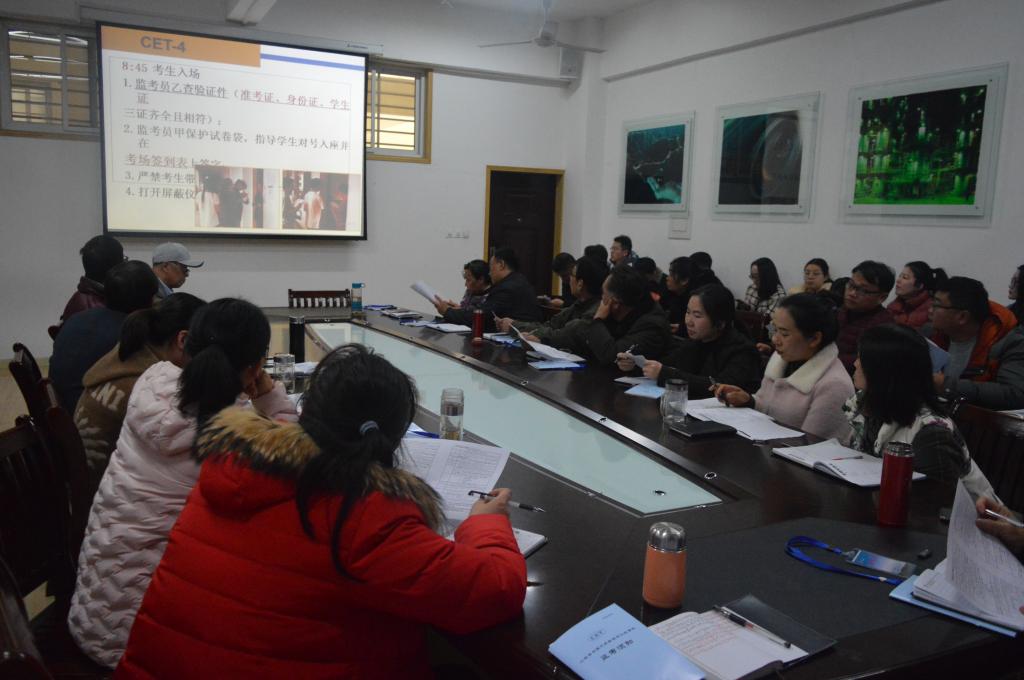 杨超带领全体教师学习四六级考试注意的事项。杨超就监考员的详细操作流程、答题卡的注意事项,条形码的粘贴位置,以及记录缺考同学的情况作了详细讲解。提醒全体教师跟往年不一样的是,今年的英语四六级考试听力时间缩短。但英语听力磁带却增加了几十秒,所以对英语四六级考试进行特别培训,就是希望在今年的考试中能够避免失误,从而引起大家的重视。