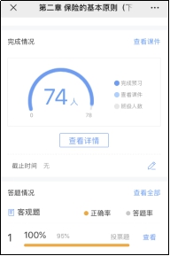3月15日在雨课堂发布手机课件,布置自主学习任务(图1),预告学生教学内容及目标、学习资源(中国大学慕课视频资源、教材资料)、课中需要讨论的三个案例,让学生带着案例进行预习,引导学生尝试解决案例中的问题(图2、3、4、5)。从预习反馈看,74位同学完成预习,并作答了课件中的预习题,整体较好(图6)。