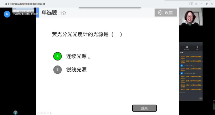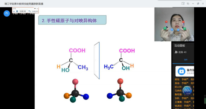 经过上学期的初赛和决赛,理工学院脱颖而出的李晓严、毛丽惠、张秋平、吕海成、李京京五位优秀教师参加了此次选拔赛。比赛伊始,赵丹向大家介绍了开展此次网络直播竞赛的背景和初衷,解读了比赛规则和评分原则。参赛教师按照顺序,依次通过理工学院钉钉办公群发起直播,用屏幕分享模式进行讲授。虽然不是现场授课,但隔着屏幕也能感受到参赛教师的热情和激情。他们或面带微笑尽情诠释着授课内容;或搬用模型来展示分子结构;或通过视频引入新课;或采用例题开展探讨。参赛教师们的精心准备,赢得了大家的肯定,直播课堂被频频点赞。