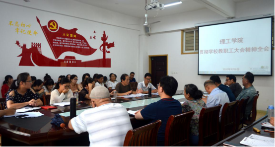 9月8日下午,理工学院贯彻学校教职工大会精神全会在理工楼201会议室召开,理工学院院长肖生发、党总支副书记张红梅以及理工学院全体教师参加了会议。张红梅主持了会议。