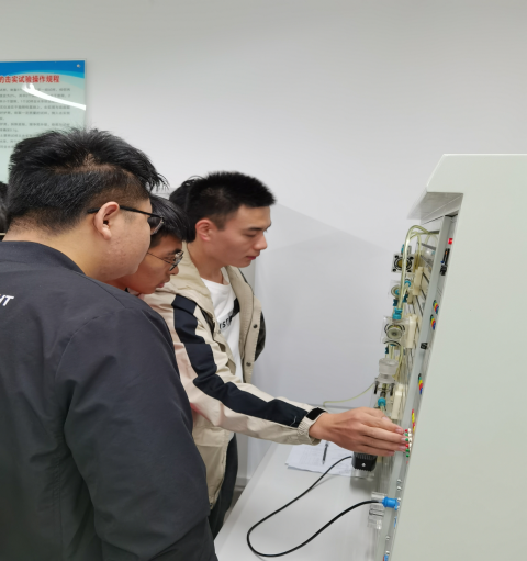 随后,徐先懂博士从实验安全注意事项,实验内容,实验总结报告,实验组织形式及实验项目等方面向同学们进行了说明。接着同学们分成三组,并以师傅带徒弟的方式进行了“行程开关控制顺序动作回路”、“用行程阀的顺序动作回路”、“液控单向阀的锁紧回路”三个实验项目的操作。整个实验过程气氛热烈,同学们互相交流,兴趣浓厚。