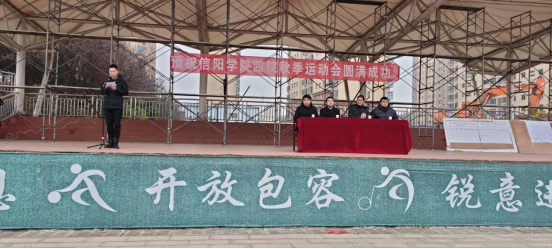 11月28日上午,由理工学院、文学院、土木工程学院、美术设计学院联合举办的四院联合秋季运动会在信阳学院东区田径场隆重召开。开幕式上,运动员代表,裁判员代表分别做了发言,承办方理工学院学工秘书杨晓杰作为教师代表发言并宣布运动会开幕。