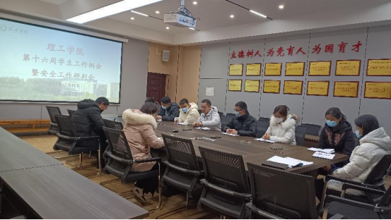 12月18日上午,理工学院学工队伍在理工楼201会议室召开第十六周学生工作例会暨安全工作研判会。理工学院党总支书记张红梅,学工全体辅导员出席会议。会议由学工秘书杨晓杰主持。
