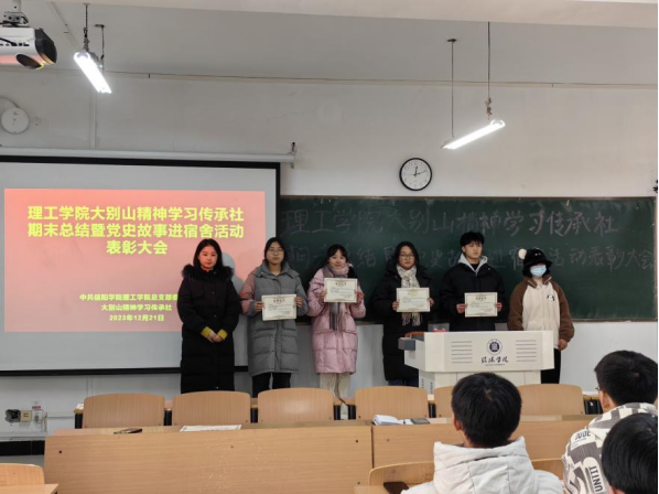 会议伊始,副社长甘玉锋老师老师对本次学院组织开展的党史故事进宿舍活动做总结发言。他指出本活动旨在进一步贯彻学习革命文化和红色精神,响应理工学院党总支的号召,推动校园文化建设。辅导员田亚星及杨翔宇分别宣读了党史故事进宿舍获奖学生和优秀宣传班级及优秀联络员名单。在颁奖环节,与会领导老师为获奖班级和个人颁发了荣誉证书。这些获奖者在党史故事进宿舍活动中,积极学习革命文化和红色精神,表现突出,他们用自己的实际行动诠释了红色精神的内涵。