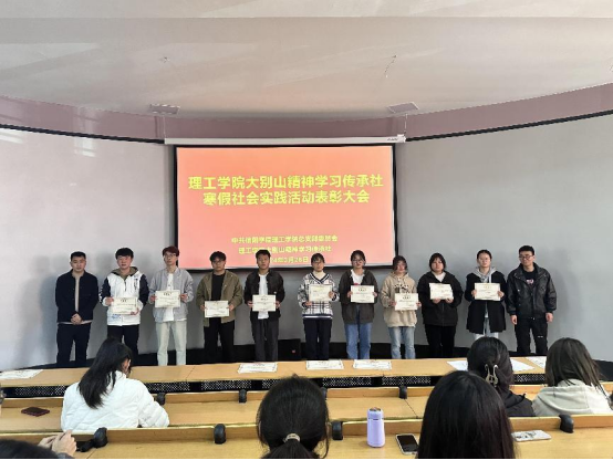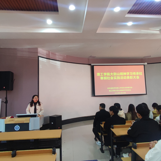 为总结寒假社会实践成果,激励学生在大别山精神学习活动中继续奋勇争先,3月28日中午,理工学院大别山精神学习传承社在理工楼116教室隆重举行2023-2024学年寒假社会实践表彰大会。党总支副书记张红梅出席会议,全体辅导员及大别山学习传承社全体社员、联络员和各班获奖代表参加了本次会议。大会由团委书记杨翔宇主持。