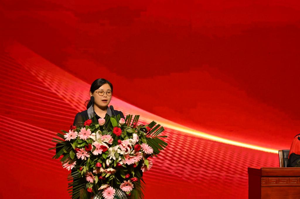 教师代表、地理科学专业副教授魏新玲老师进行发言,她为2024届毕业生送上祝福的同时,告诫毕业生们要保持健康的身体和乐观的心态,读万卷书、行万里路、再加上名人指路、自己在实践的过程中不断去悟可以解决难题,造就越来越棒的自己。