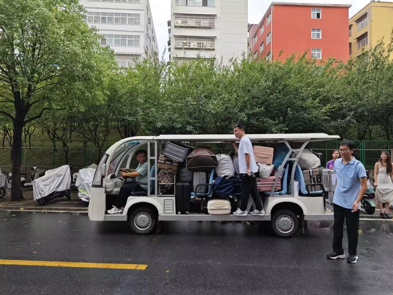 下午三点,理工学院党总支组织委员杨晓杰带领一众党员教师们驾驶校园摆渡车到女生宿舍20、18、14、10号宿舍楼下,党员教师们不辞劳苦,冒着暴雨帮助学生将行李包裹装到车上;党员教师鲁有强开私家车到四号宿舍楼帮学生搬运行李,整个过程团结协作,分工配合,搬迁工作进行得井然有序。下午五点左右,整个搬迁工作顺利完成,同学们为志愿老师们送去矿泉水,向他们表达衷心的感谢。