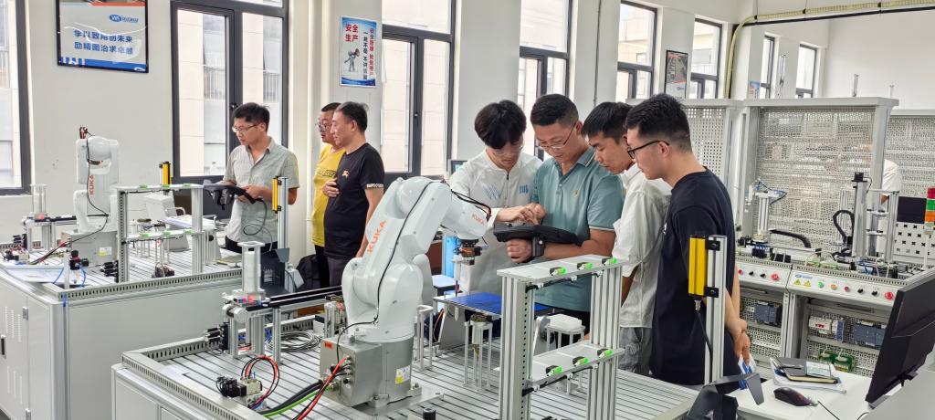 本次培训在生产车间进行,培训内容有工业机器人综合应用实训、现代电气与PLC应用技术实训和模块式智能生产线运维综合实训。培训方式由企业工程师分小组交叉对信阳学院教师进行培训,培训时间同企业员工上班时间一致。