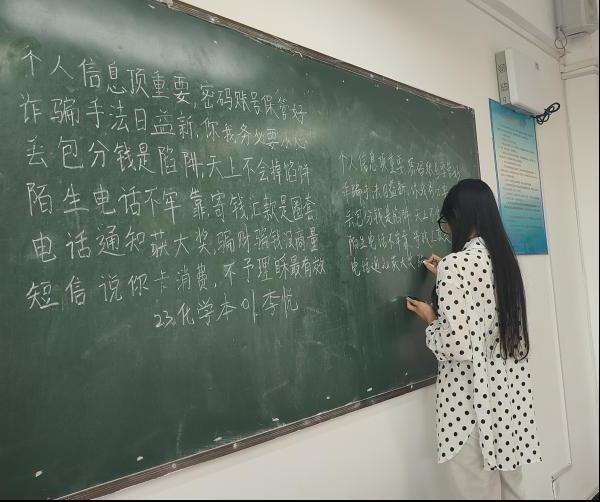 本次比赛分为:毛笔、硬笔、粉笔三个组别,以多元书写形式筑牢反诈防线。主持人为选手们解说比赛规则和注意事项后,宣布比赛正式开始。比赛过程中,选手们屏息凝神,手中的笔在纸上、黑板上挥洒自如。他们的作品内容巧妙融合反诈元素,将防骗智慧融入一撇一捺之间,让传统的书法艺术焕发出崭新的时代生命力。