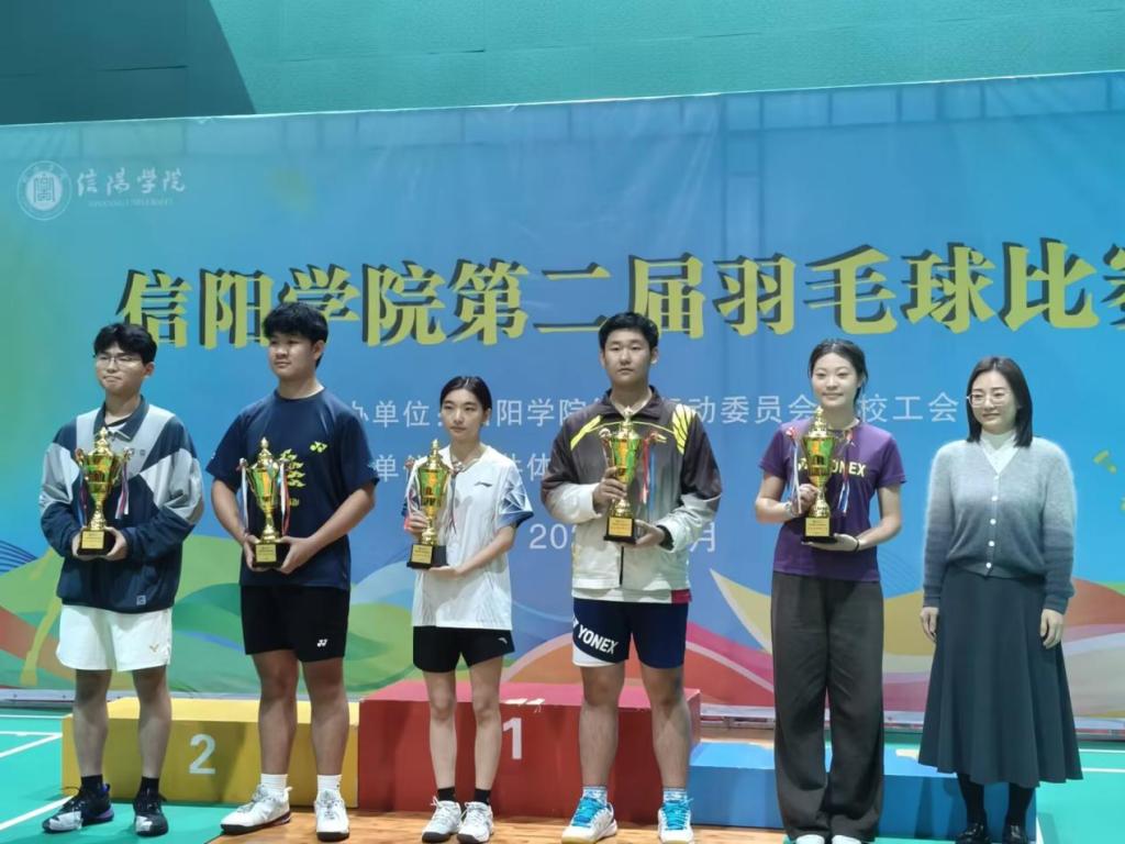 2025年10月31日,信阳学院第二届羽毛球比赛在全校师生的瞩目下完美落幕。此次活动旨在促进运动技能提升、加强各学院之间的交流与合作,同时丰富校园生活、弘扬体育精神。理工学院羽毛球队积极响应、认真备战,以饱满的热情和高昂的斗志投入到比赛中,取得了教工组团体赛第五名、王琴老师获教工组女子单打第五名、学生组团体赛第七名、蔡世豪获学生组男子单打第八名的好成绩,赢得广泛赞誉。