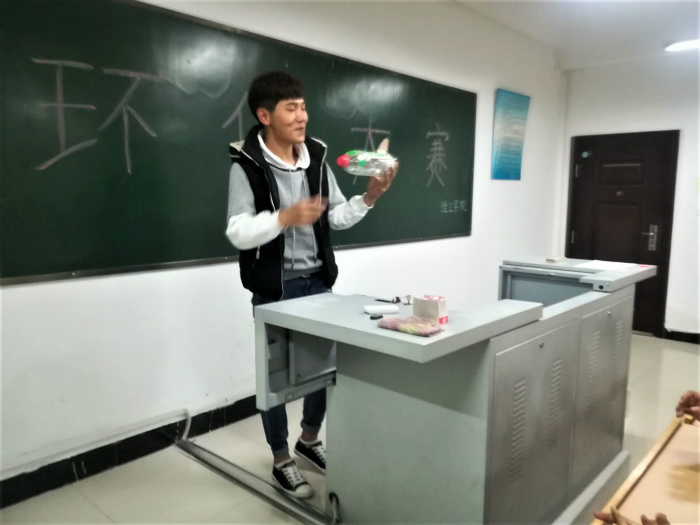 活动开始,生卫部部长向同学们提出了一些问题。随后主持人通过图片向观众介绍了一系列污染现象,看着那些原本美丽的风景被破坏,现场气氛一度变得压抑,更使我们深刻意识到环保的重要性。发挥创意的时间到了,在仅有的30分钟内制作一个作品,同学们踊跃参加。30分钟后,心灵手巧的同学们制作出各式各样的作品:以瓶子为身体的飞机;以箱子为外壳的收纳盒……随后又播放了因人类活动不当而造成动物死亡的视频,看着那些可怜的动物,满满的内疚之感涌上心头,使得同学们的环保意志更加坚定。随后,几个同学代表将写好的日常废弃物纸片分类回收。最后为表现积极的席月、张玉春、高鑫三位同学颁奖,同时也为参加此次活动的同学发放了小奖品。