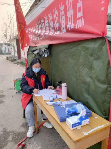 疫情就是命令,防控就是责任。在接到上级通知的下一刻,村干部开始在各个路口设置疫情防控值班点,各个村干部轮流值班,而2020级化学本科2班的任金燕同学也自愿加入其中。