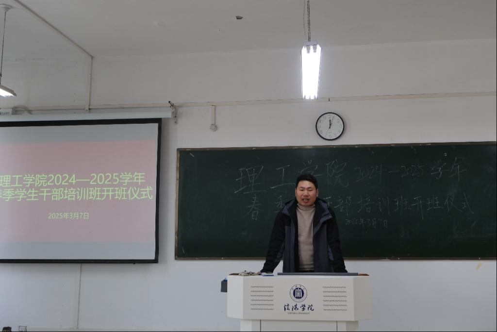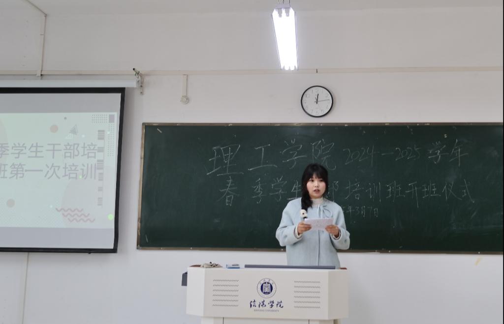 为提升学生干部综合素质与工作能力,加强校园建设,促进学生工作开展,搭建学校与学生沟通桥梁。3月7日,理工学院2024-2025学年春季学生干部培训班开班仪式暨第一次培训会在理工楼502圆满举行,此次开班仪式由杨翔宇老师主讲,第一次培训由团支书代表王雨开展。