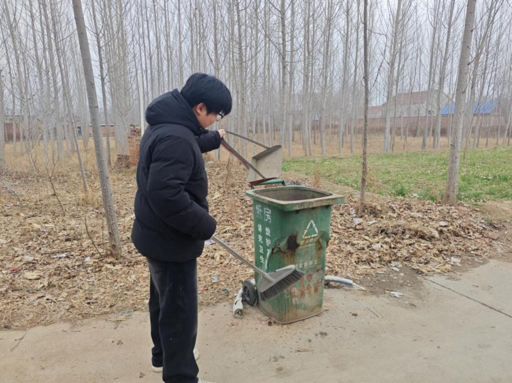 新春将至,乡村人居环境整治行动正如火如荼开展。刘福康同学穿梭在村庄的街头巷尾,手持清洁工具,对道路两侧的落叶、杂物和卫生死角进行全面清理,还主动协助村民整理庭院内外的物品,让村容村貌焕然一新。针对春节期间垃圾量激增的特点,他还化身环保宣传员,走家串户讲解垃圾分类知识,引导村民将厨余垃圾、可回收物分类投放,从源头减少环境污染。