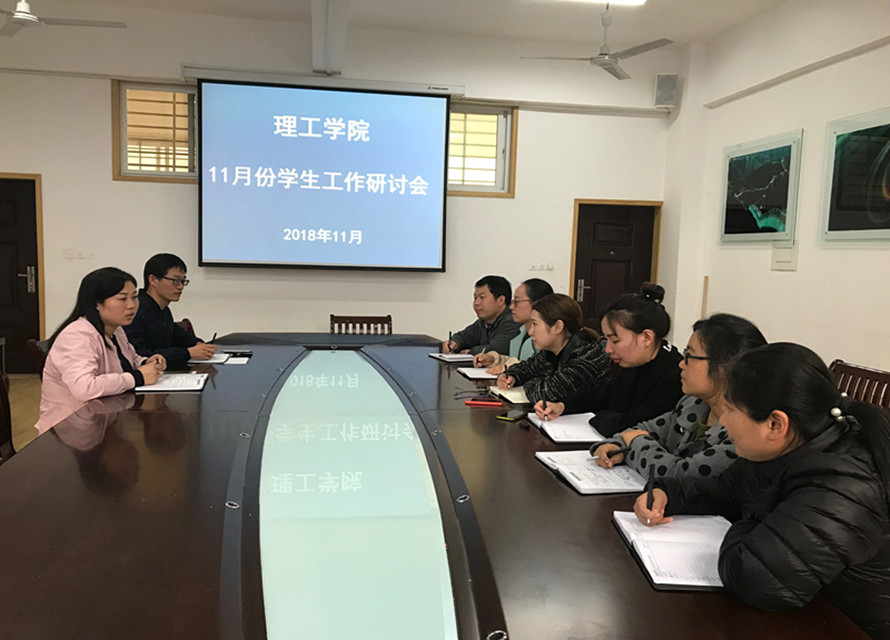11月23日上午,在理工楼201会议室,理工学院召开十一月份辅导员工作研讨会。会议由该院党总支副书记张红梅主持,学工秘书杨晓杰、团总支书记梁书荣、辅导员张文银、黄艳伟、刘硕、张若琳、张帆参加,会议对安全问题和公寓文化节进行了部署和讨论。