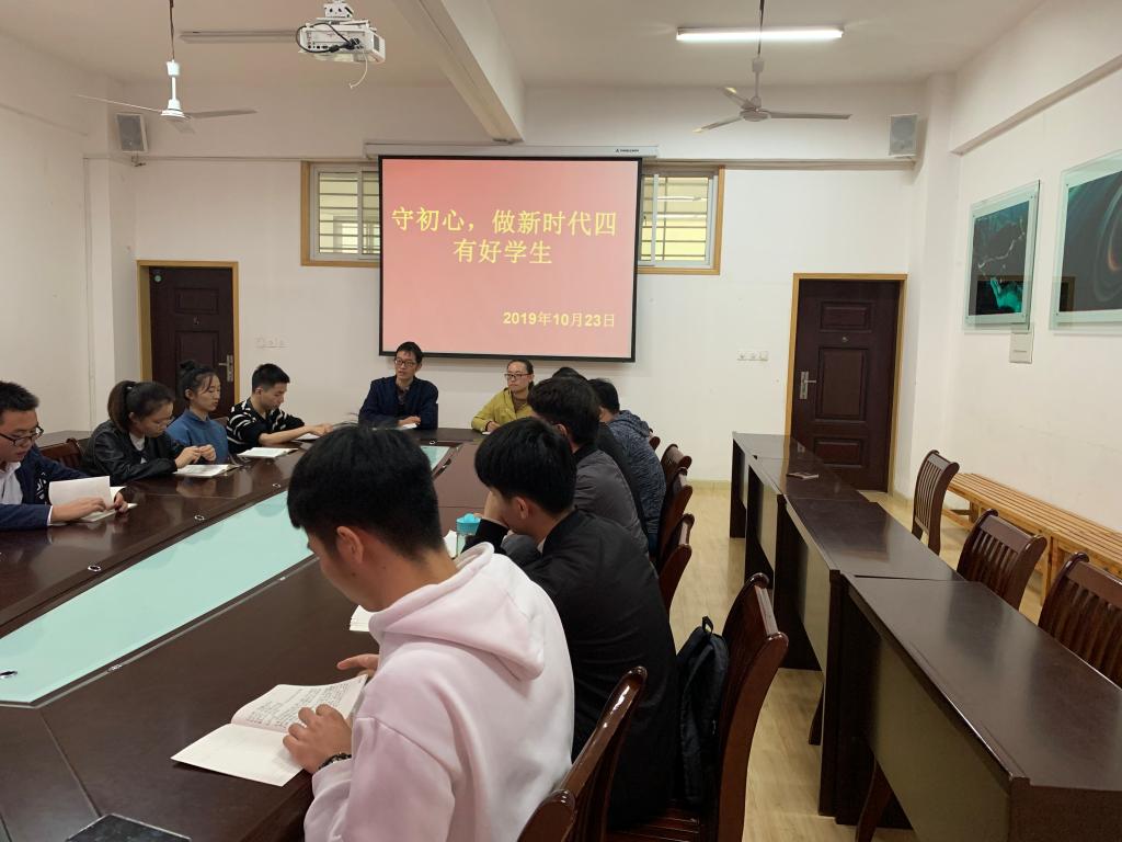 10月23日,信阳学院理工学院学生第一党支部在理工楼201会议室开展以“守初心,做新时代四有好学生”为主题的讨论活动。作为新时代的大学生,更应该争做“有理想、有道德、有纪律、有文化”的四有好学生。会议由支部书记杨晓杰、副书记张帆和学生第一党支部全体成员参加此次会议。